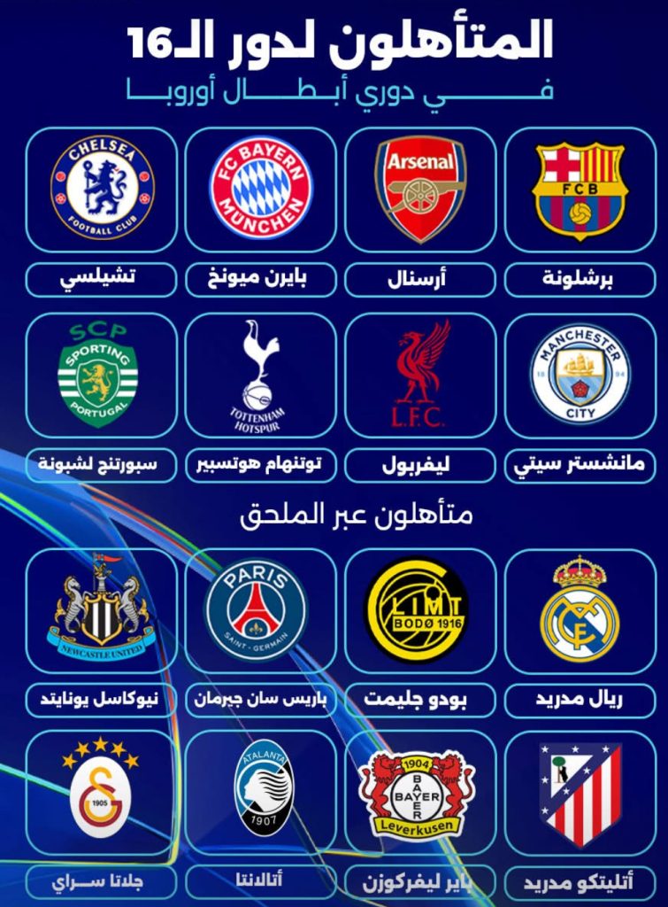 وضمت قائمة المتأهلين مباشرة أندية تشيلسي، بايرن ميونخ، أرسنال، برشلونة، إلى جانب سبورتينج لشبونة، توتنهام، ليفربول، ومانشستر سيتي، بعد مشوار قوي في دور المجموعات.
