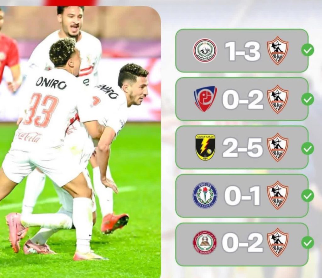 يقدم موقع ايجيبت سكور احصائية ، نجح نادي الزمالك في تحقيق خمسة انتصارات متتالية في مسابقة الدوري المصري الممتاز، في إنجاز يُسجل لأول مرة منذ موسم 2021/2022، عندما تُوج الفريق بلقب الدوري الأخير.