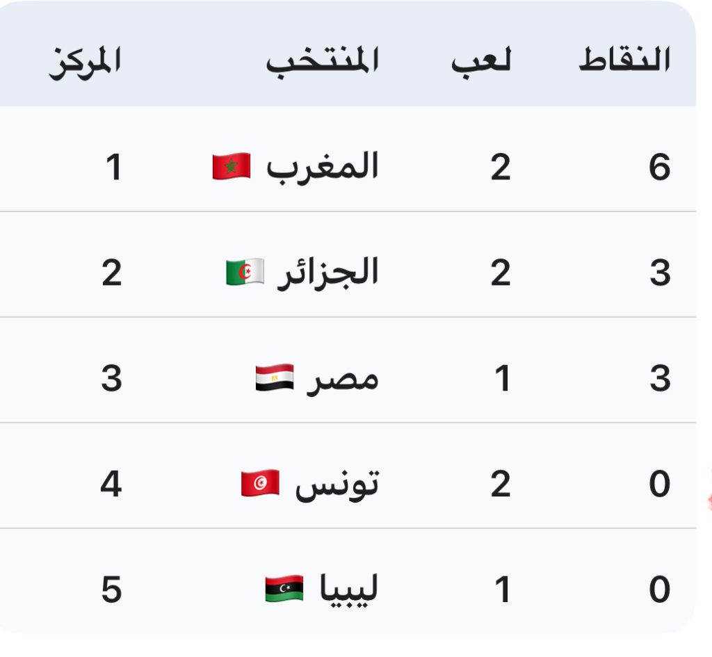في المركز الثاني، يأتي المنتخب الجزائري برصيد 3 نقاط من مباراتين (فوز وخسارة)، متفوقاً بفارق الأهداف أو المواجهات على المنتخب المصري بقيادة حسين عبد اللطيف وعبد الستار صبري الذي يحتل المركز الثالث بنفس الرصيد (3 نقاط)، ولكن من مباراة واحدة فقط، مما يعطي “الفراعنة” أفضلية حسابية للارتقاء في الترتيب في حال فوزهم في لقائهم القادم.