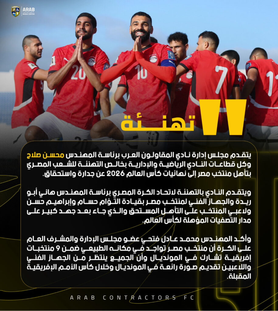 أشاد مجلس إدارة نادي المقاولون العرب برئاسة المهندس محسن صلاح، وجميع قطاعات النادي الرياضية والإدارية، بالإنجاز الكبير الذي حققه منتخب مصر بالتأهل إلى نهائيات كأس العالم 2026 عن جدارة واستحقاق.