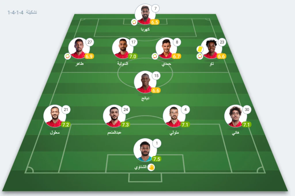 خط الوسط: ديانج (6.6)، بيرسي تاو (6.6)، حمدي فتحي (6.7)، عمرو السولية (7)، طاهر محمد طاهر (6.9).