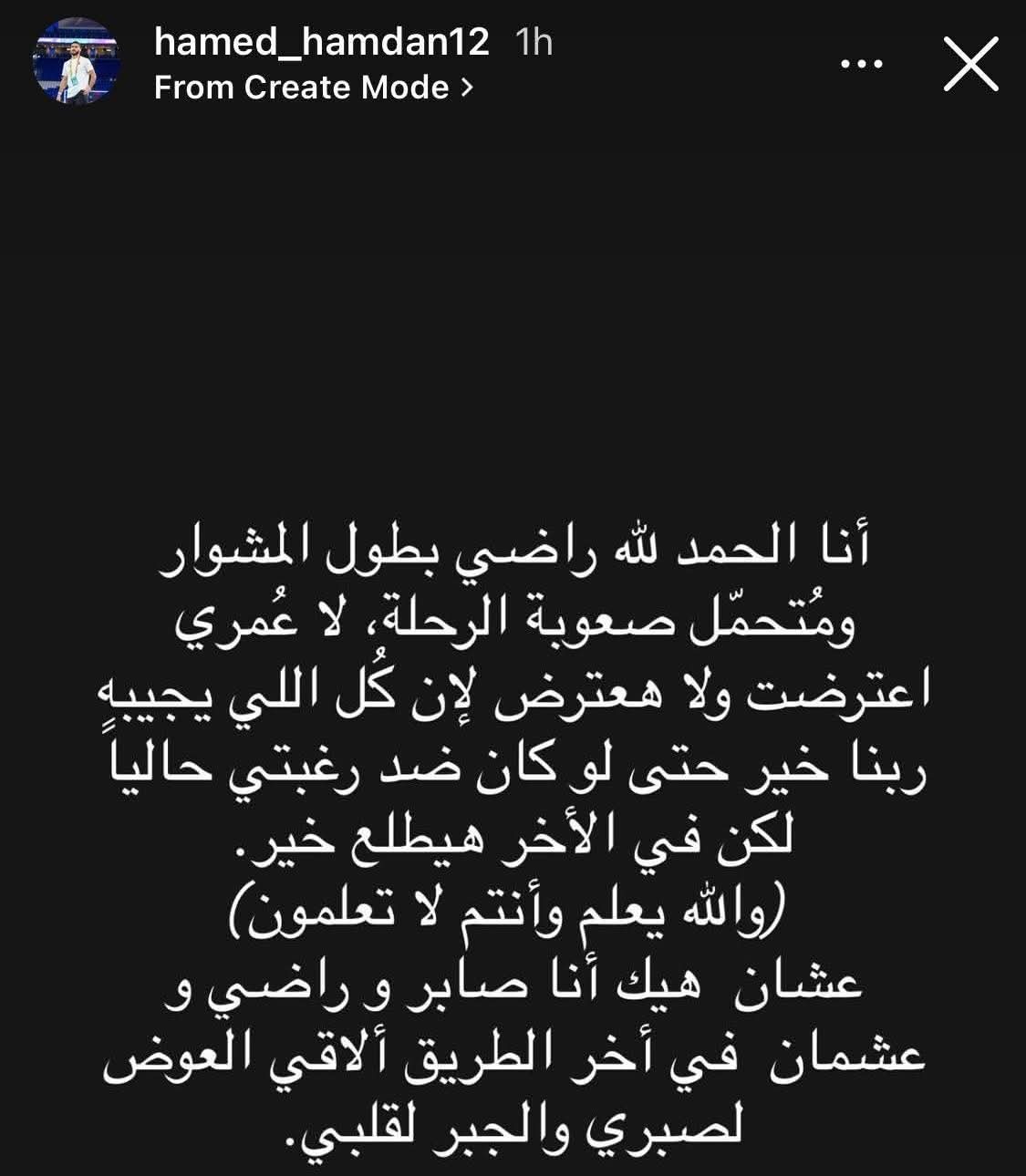 نشر الفلسطيني حامد حمدان، لاعب وسط فريق بتروجت، رسالة مؤثرة عبر حسابه على إنستجرام، عبّر فيها عن رضاه التام وصبره على ما يمر به من ضغوط، في ظل تعثر انتقاله إلى الزمالك خلال فترة الانتقالات الصيفية.