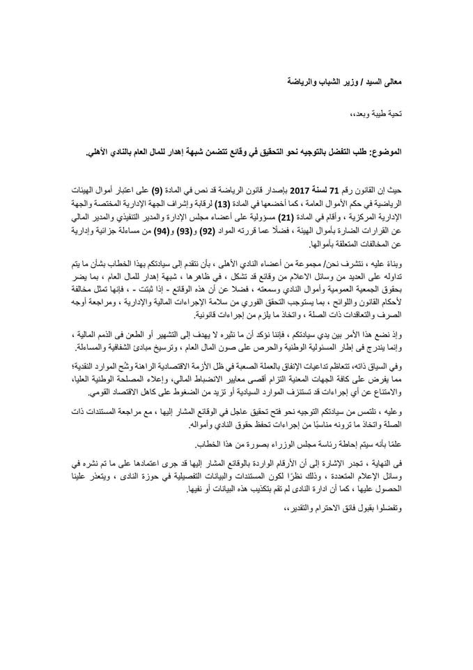 تقدمت مجموعة من أعضاء النادي الأهلي بشكوى رسمية إلى جوهر نبيل، وزير الشباب والرياضة، ضد مجلس إدارة النادي برئاسة محمود الخطيب، وذلك للمطالبة بفتح تحقيق عاجل في وقائع تتضمن شبهة إهدار المال العام.