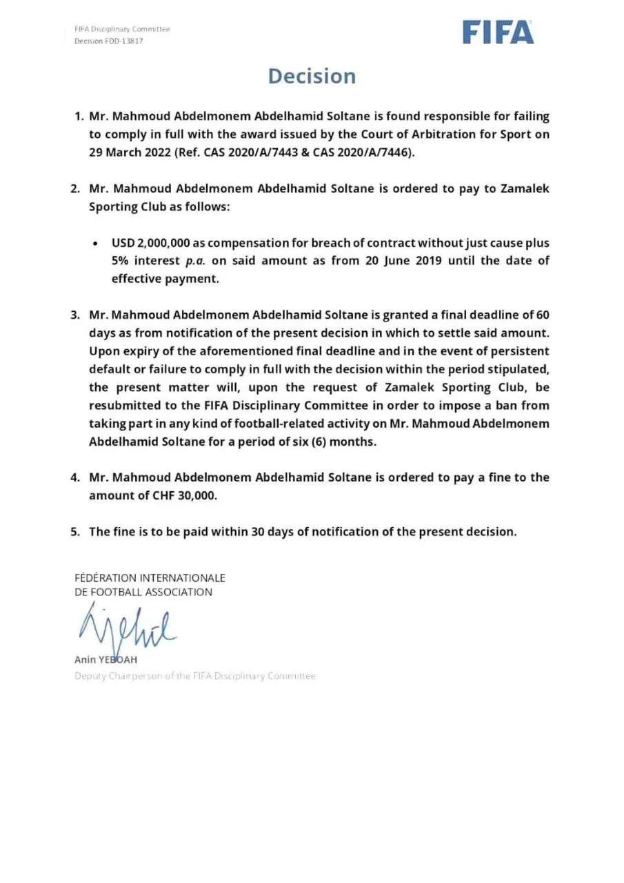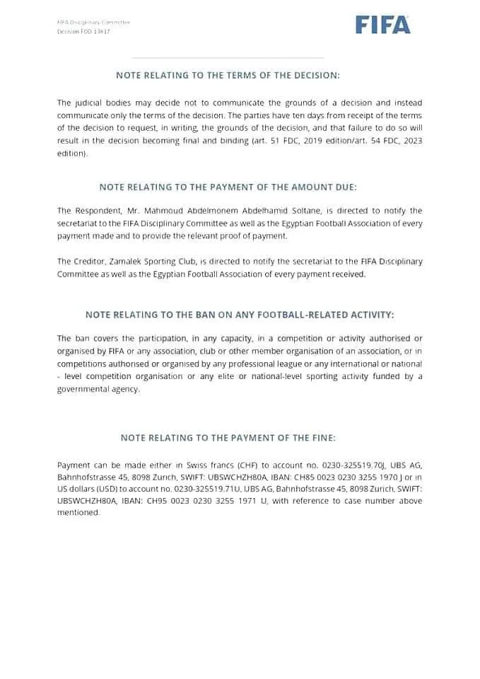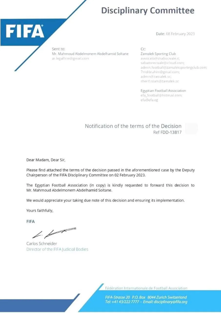 كما طالبت اللجنة التأديبية نادي الزمالك بإخطار سكرتارية الفيفا للتأديب وكذلك لجنة الاتحاد المصري لكرة القدم حال تلقي مبلغ الغرامة من اللاعب.