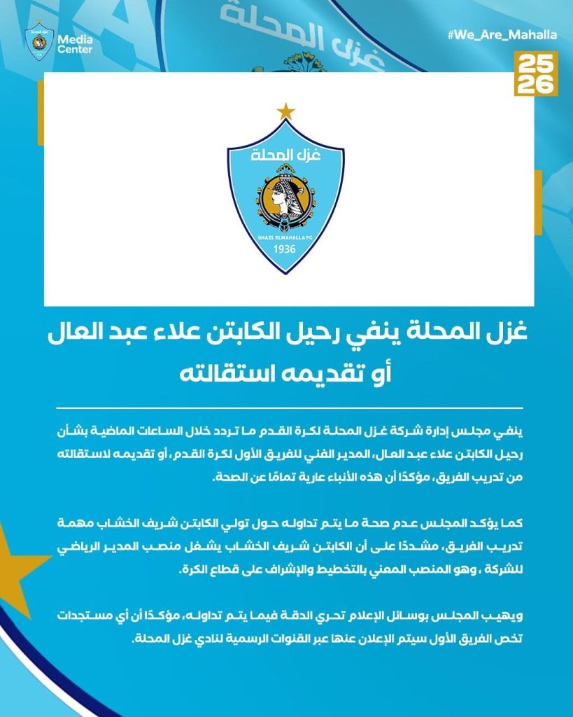 وفي ختام بيانه، ناشد مجلس الإدارة وسائل الإعلام تحري الدقة قبل نشر أي أخبار تخص النادي، مؤكدًا أن أي مستجدات تتعلق بالفريق الأول سيتم الإعلان عنها فقط عبر القنوات الرسمية لنادي غزل المحلة.