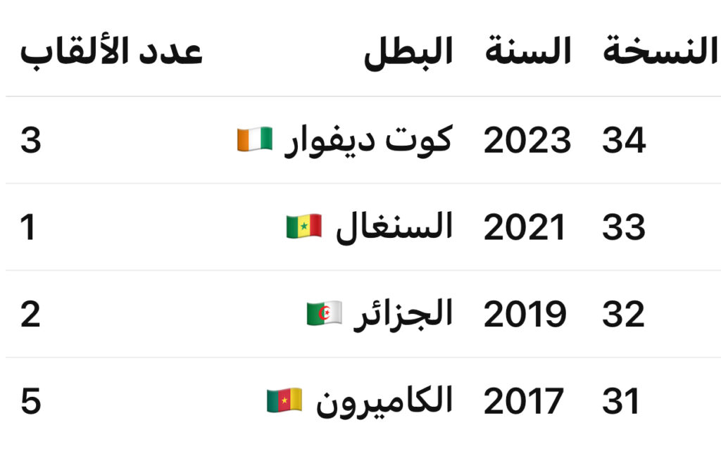 وشهدت النسخ الأربع الأخيرة تتويج أربعة منتخبات مختلفة، في مؤشر واضح على اشتعال المنافسة وتكافؤ الحظوظ بين كبار القارة السمراء.