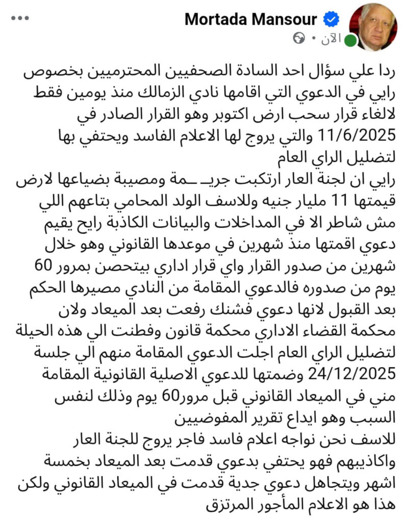 أطلق المستشار مرتضى منصور تصريحات نارية ردًّا على سؤال أحد الصحفيين حول الدعوى التي أقامها نادي الزمالك قبل يومين للطعن على قرار سحب أرض أكتوبر الصادر في 11 يونيو 2025، مؤكدًا أن ما يروّج له الإعلام بشأن هذه الدعوى “تضليل للرأي العام”.