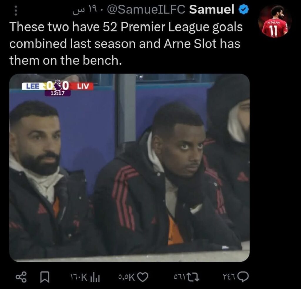 “هذان اللاعبان سجّلا 52 هدفًا في الدوري الإنجليزي الموسم الماضي، ومع ذلك آرني سلوت يضعهما على الدكة.”